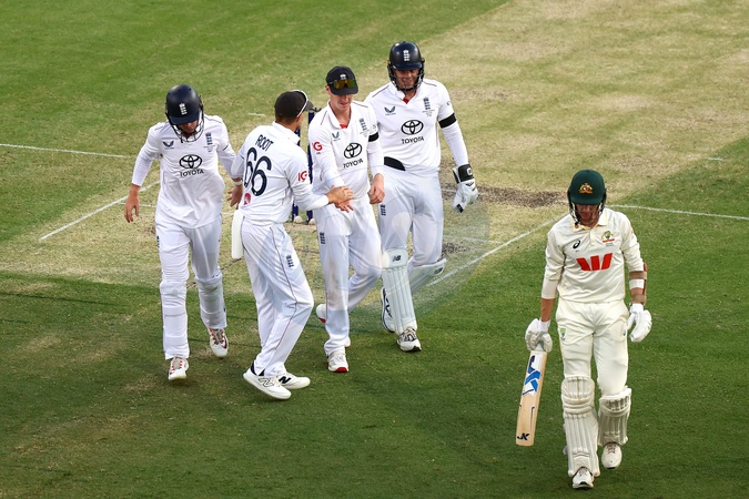 England celebrate during Day 3 of the Second Test in the NRMA Insurance Ashes Series Australia vs England at The Gabba, Brisbane Cricket Ground, Brisbane, Australia, 6th December 2025, Credit:Patrick Hoelscher/News Images / Avalon