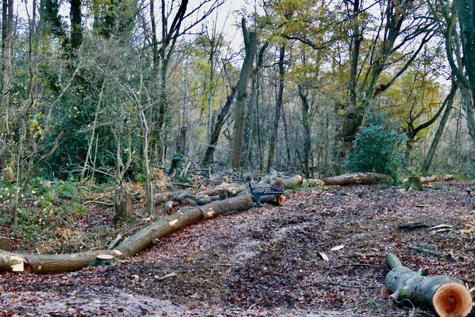 Trees are cut down and landscapes are changed during a major Ash Dieback outbreak in the copse. Ash dieback is affecting Clayfield Copse, leading Reading Borough Council to fell trees near public paths due to the risk of falling, brittle branches. The disease, caused by a fungus, weakens and can kill ash trees, and there is currently no known treatment. Fallen trees will be replaced with native species like oak, hazel, and birch, and any resilient ash trees will be left standing., Credit:Geoffrey Swaine / Avalon