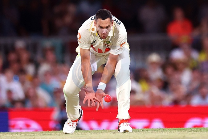 Scott Boland of Australia fields the ball during Day 3 of the Second Test in the NRMA Insurance Ashes Series Australia vs England at The Gabba, Brisbane Cricket Ground, Brisbane, Australia, 6th December 2025, Credit:Patrick Hoelscher/News Images / Avalon