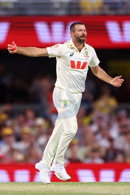 Michael Neser of Australia dismisses Ollie Pope of England during Day 3 of the Second Test in the NRMA Insurance Ashes Series Australia vs England at The Gabba, Brisbane Cricket Ground, Brisbane, Australia, 6th December 2025, Credit:Patrick Hoelscher/News Images / Avalon