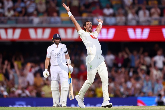 Mitchell Starc of Australia celebrates the dismissal of Joe Root of England during Day 3 of the Second Test in the NRMA Insurance Ashes Series Australia vs England at The Gabba, Brisbane Cricket Ground, Brisbane, Australia, 6th December 2025, Credit:Patrick Hoelscher/News Images / Avalon