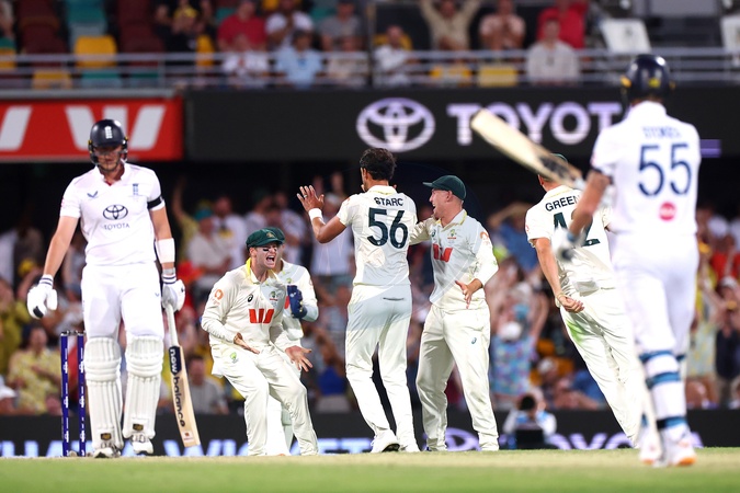 Australia celebrate the dismissal of Jamie Smith of England during Day 3 of the Second Test in the NRMA Insurance Ashes Series Australia vs England at The Gabba, Brisbane Cricket Ground, Brisbane, Australia, 6th December 2025, Credit:Patrick Hoelscher/News Images / Avalon