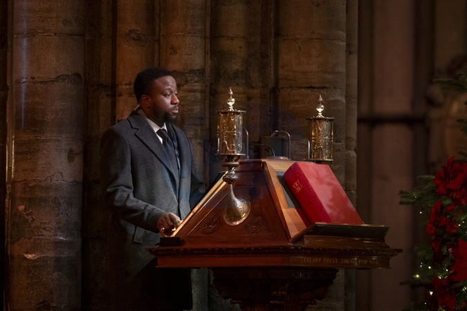 EMBARGOED TO 1030 SATURDAY DECEMBER 6 Babatunde Aleshe gives a reading during the Together At Christmas carol service at Westminster Abbey in London. Picture date: Friday December 5, 2025., Credit:Aaron Chown / Avalon