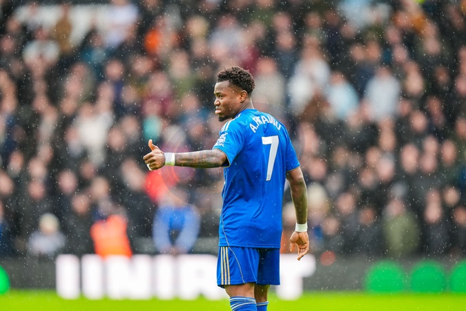 Abdul Fatawu of Leicester City gives teammates a thumbs up during the Sky Bet Championship match Derby County vs Leicester City at Pride Park Stadium, Derby, United Kingdom, 6th December 2025, Credit:Maynard Manyowa/News Images / Avalon