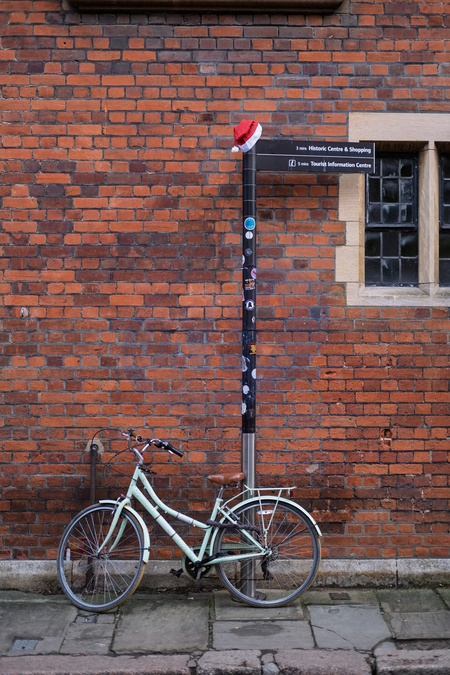 Bicycle in the centre of Cambridge by directions sign with christmas hat on pole, Cambridgeshire. UK
