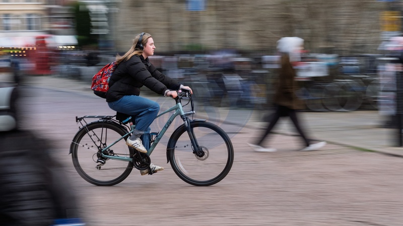 Bicycle in motion in the centre of Cambridge, Cambridgeshire. UK