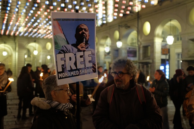 December 5, 2025, Turin, Piazza Palazzo di Città. A demonstration, simultaneously in several Italian squares, for Turin imam Mohamed Shahin, incarcerated in the Caltanissetta CPR awaiting repatriation to Egypt. He is charged with justifying the October 7 massacre., Credit:Selene Daniele / Avalon
