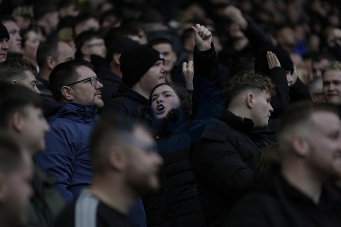 Derby fans celebrate their team scoring a goal to make it 1-3 during the Sky Bet Championship match Derby County vs Leicester City at Pride Park Stadium, Derby, United Kingdom, 6th December 2025, Credit:Maynard Manyowa/News Images / Avalon