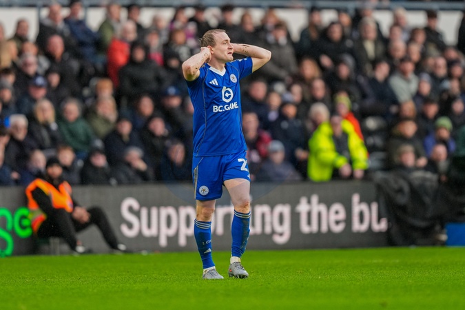 Oliver Skipp of Leicester City remonstrates after being penalised for a foul during the Sky Bet Championship match Derby County vs Leicester City at Pride Park Stadium, Derby, United Kingdom, 6th December 2025, Credit:Maynard Manyowa/News Images / Avalon