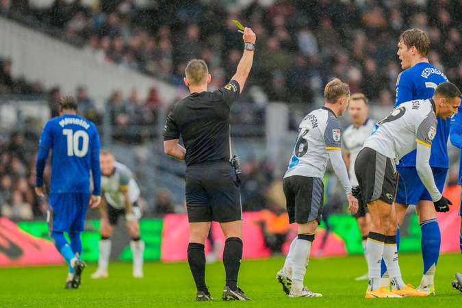 Liam Thompson of Derby County is shown a yellow card during the Sky Bet Championship match Derby County vs Leicester City at Pride Park Stadium, Derby, United Kingdom, 6th December 2025, Credit:Maynard Manyowa/News Images / Avalon