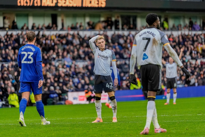 Bobby Clark of Derby County stands dejected after Derby miss a chance during the Sky Bet Championship match Derby County vs Leicester City at Pride Park Stadium, Derby, United Kingdom, 6th December 2025, Credit:Maynard Manyowa/News Images / Avalon