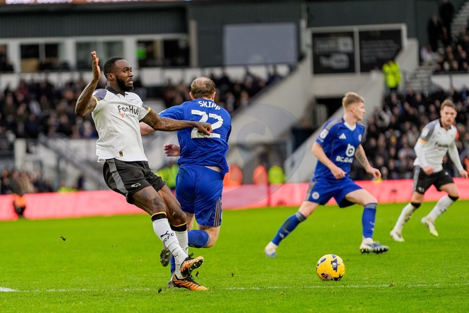Corey Blackett-Taylor of Derby County dribbles the ball and loses it under a challenge from Oliver Skipp of Leicester City during the Sky Bet Championship match Derby County vs Leicester City at Pride Park Stadium, Derby, United Kingdom, 6th December 2025, Credit:Maynard Manyowa/News Images / Avalon