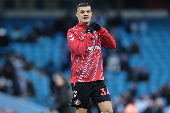 GranitXhaka of Sunderland in the pregame warmup session during the Premier League match Manchester City vs Sunderland at Etihad Stadium, Manchester, United Kingdom, 6th December 2025, Credit:Mark Cosgrove/News Images / Avalon
