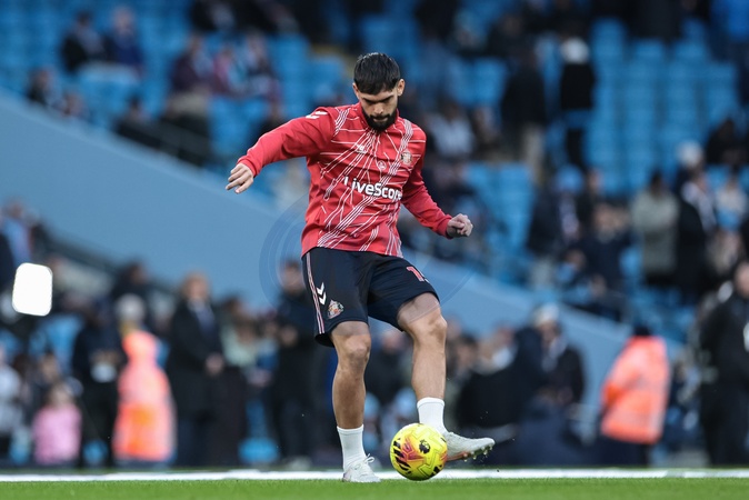 Omar Alderete of Sunderland in the pregame warmup session during the Premier League match Manchester City vs Sunderland at Etihad Stadium, Manchester, United Kingdom, 6th December 2025, Credit:Mark Cosgrove/News Images / Avalon
