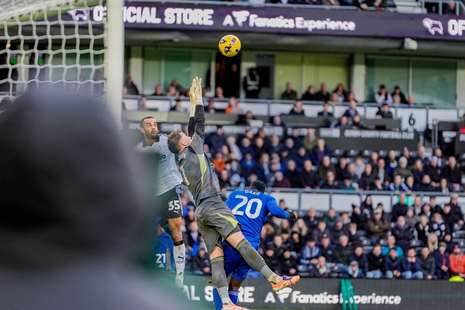 Jakub Stolarczyk of Leicester City leaps to claim a cross during the Sky Bet Championship match Derby County vs Leicester City at Pride Park Stadium, Derby, United Kingdom, 6th December 2025, Credit:Maynard Manyowa/News Images / Avalon
