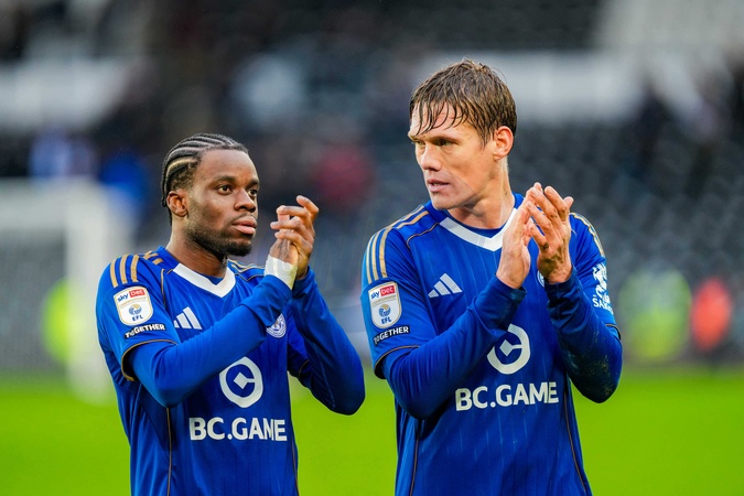Jannik Vestergaard of Leicester City and Caleb Okoli of Leicester City during the Sky Bet Championship match Derby County vs Leicester City at Pride Park Stadium, Derby, United Kingdom, 6th December 2025, Credit:Maynard Manyowa/News Images / Avalon