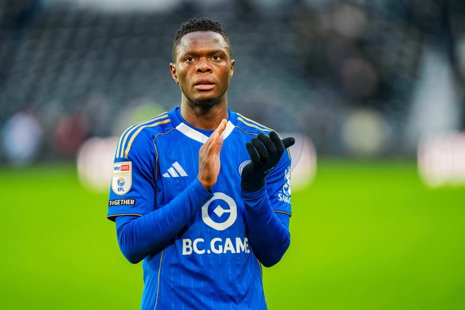 Patson Daka of Leicester City applauds fans during the Sky Bet Championship match Derby County vs Leicester City at Pride Park Stadium, Derby, United Kingdom, 6th December 2025, Credit:Maynard Manyowa/News Images / Avalon