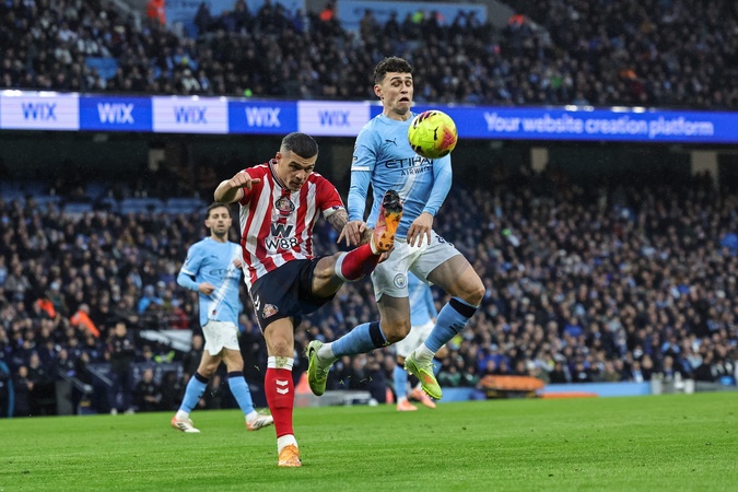 GranitXhaka of Sunderland clears the ball up field under pressure from Phil Foden of Manchester City during the Premier League match Manchester City vs Sunderland at Etihad Stadium, Manchester, United Kingdom, 6th December 2025, Credit:Mark Cosgrove/News Images / Avalon