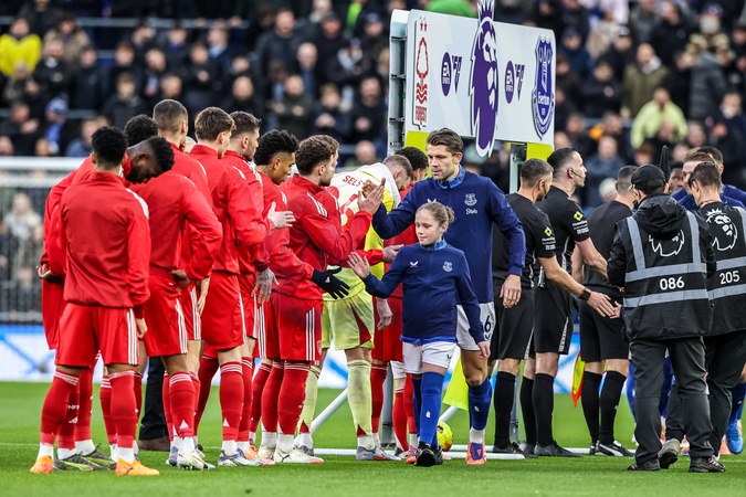 James Tarkowski of Everton shakes hands with the Forest players before the game during the Premier League match Everton vs Nottingham Forest at Hill Dickinson Stadium, Liverpool, United Kingdom, 6th December 2025, Credit:Ae Cosgrove/News Images / Avalon