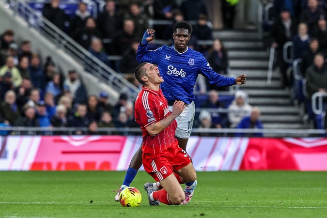 Nikola Milenkovic of Nottingham Forest is fouled by Thierno Barry of Everton during the Premier League match Everton vs Nottingham Forest at Hill Dickinson Stadium, Liverpool, United Kingdom, 6th December 2025, Credit:Ae Cosgrove/News Images / Avalon