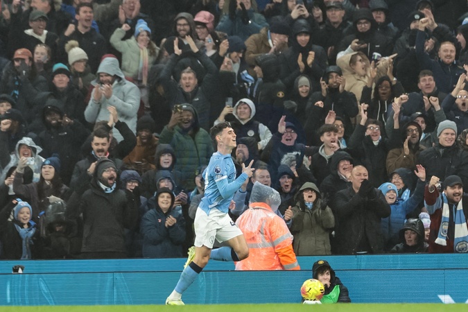 Phil Foden of Manchester City celebrates his goal to make it 3-0 during the Premier League match Manchester City vs Sunderland at Etihad Stadium, Manchester, United Kingdom, 6th December 2025, Credit:Mark Cosgrove/News Images / Avalon