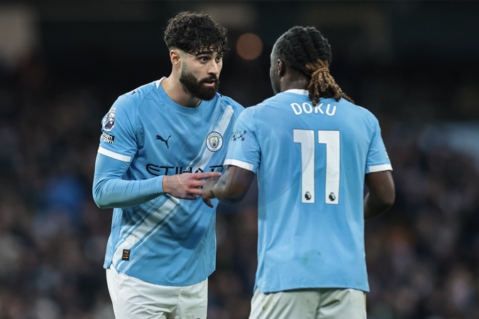 Josko Gvardiol of Manchester City speaks to Jeremy Doku of Manchester City during the Premier League match Manchester City vs Sunderland at Etihad Stadium, Manchester, United Kingdom, 6th December 2025, Credit:Mark Cosgrove/News Images / Avalon
