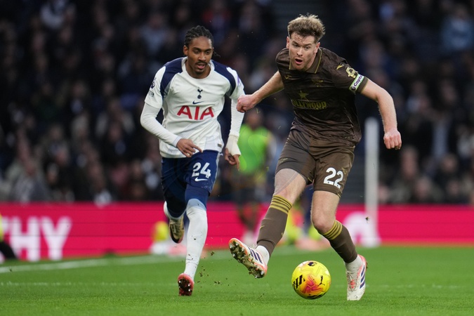 Nathan Collins of Brentford passes under pressure during the Premier League match Tottenham Hotspur vs Brentford at Tottenham Hotspur Stadium, London, United Kingdom, 6th December 2025, Credit:Harvey Murphy/News Images / Avalon