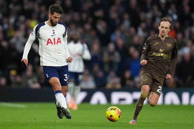 Rodrigo Bentancur of Tottenham Hotspur plays pass under pressure during the Premier League match Tottenham Hotspur vs Brentford at Tottenham Hotspur Stadium, London, United Kingdom, 6th December 2025, Credit:Harvey Murphy/News Images / Avalon