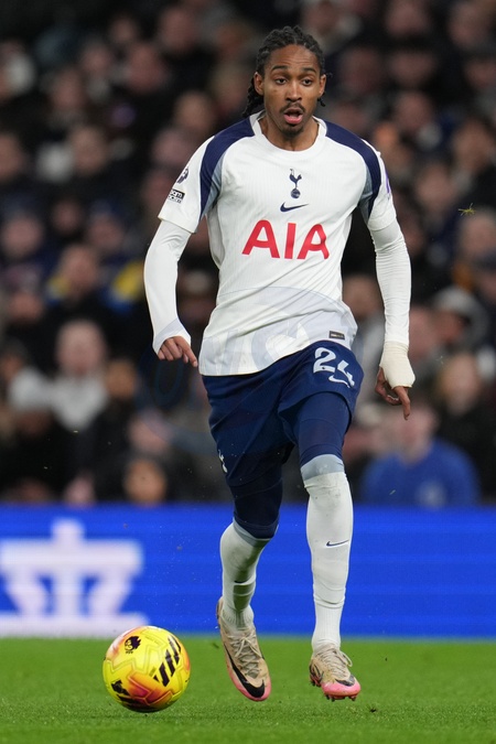 Djed Spence of Tottenham Hotspur on the ball during the Premier League match Tottenham Hotspur vs Brentford at Tottenham Hotspur Stadium, London, United Kingdom, 6th December 2025, Credit:Harvey Murphy/News Images / Avalon