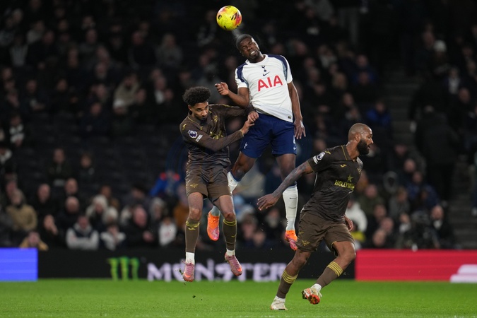 Kevin Danso of Tottenham Hotspur wins header over Igor Thiago of Brentford and Kevin Schade of Brentford during the Premier League match Tottenham Hotspur vs Brentford at Tottenham Hotspur Stadium, London, United Kingdom, 6th December 2025, Credit:Harvey Murphy/News Images / Avalon