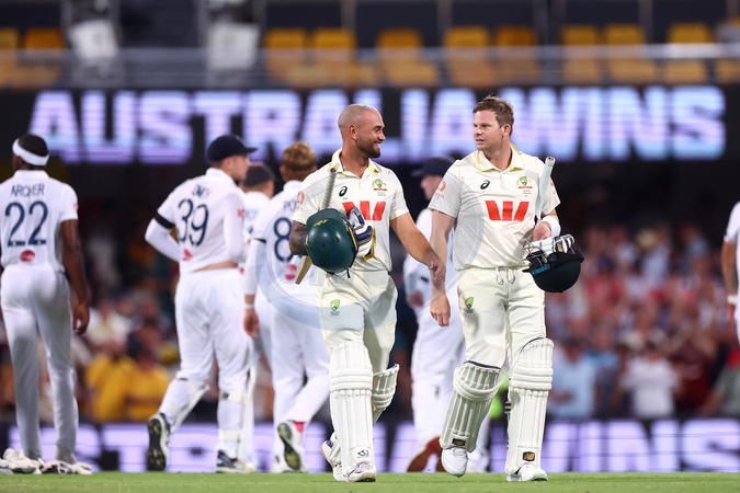 Steve Smith of Australia celebrates Australia winning during the day 4 of the Second Test in the NRMA Insurance Ashes Series Australia vs England at The Gabba, Brisbane Cricket Ground, Brisbane, Australia, 7th December 2025, Credit:Pat Hoelscher/News Images / Avalon