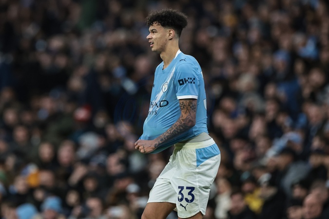 Nico O'Reilly of Manchester City wipes the ball during the Premier League match Manchester City vs Sunderland at Etihad Stadium, Manchester, United Kingdom, 6th December 2025, Credit:Mark Cosgrove/News Images / Avalon