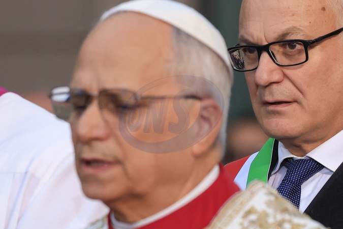 Feast of the Immaculate Conception of Mary, ceremony in Piazza Mignanelli, near the Spanish Steps. In the photo, Roberto Gualtieri behind Pope Leo XIV. Rome, Italy 08 December 2025, Credit:Richard De Luca / Avalon