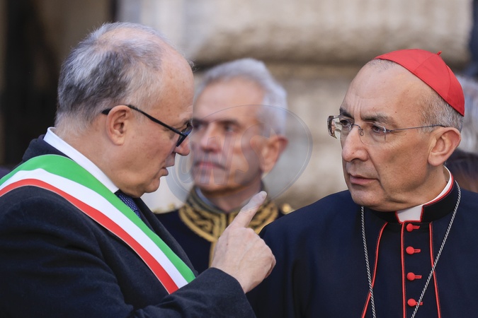 Feast of the Immaculate Conception of Mary, ceremony in Piazza Mignanelli, near the Spanish Steps. Pictured: Roberto Gualtieri and Cardinal Vicar Baldassare Reina. Rome, Italy 08 December 2025, Credit:Richard De Luca / Avalon