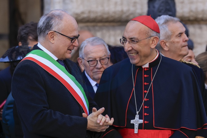 Feast of the Immaculate Conception of Mary, ceremony in Piazza Mignanelli, near the Spanish Steps. Pictured: Roberto Gualtieri and Cardinal Vicar Baldassare Reina. Rome, Italy 08 December 2025, Credit:Richard De Luca / Avalon