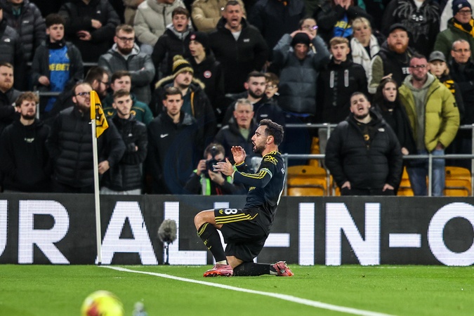 Bruno Fernandes of Manchester Untied celebrates his goal to make it 0-1 during the Premier League match Wolverhampton Wanderers vs Manchester United at Molineux, Wolverhampton, United Kingdom, 8th December 2025, Credit:Ae Cosgrove/News Images / Avalon