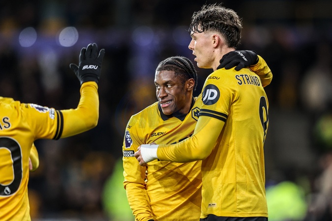 Jean-Ricner Bellegarde of Wolverhampton Wanderers celebrates his goal to make it 1-1 during the Premier League match Wolverhampton Wanderers vs Manchester United at Molineux, Wolverhampton, United Kingdom, 8th December 2025, Credit:Ae Cosgrove/News Images / Avalon