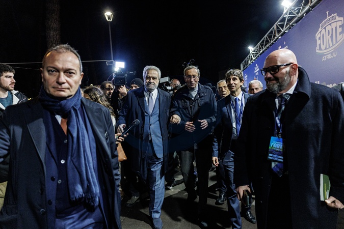 08/12/2025 Rome, Atreju 2025 Brothers of Italy party at Castel Sant'Angelo, pictured Giovanni Donzelli and Gianfranco Fini, Credit:Francesco Fotia / Avalon