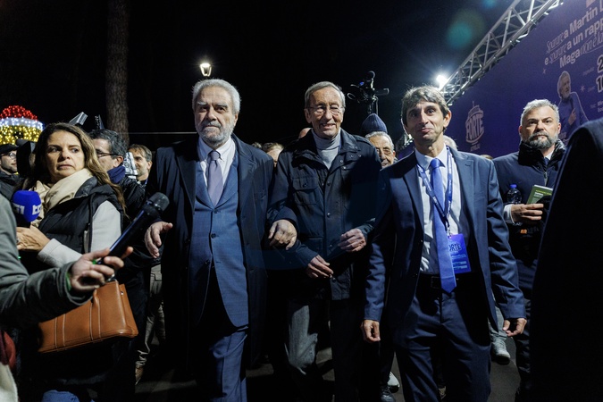 08/12/2025 Rome, Atreju 2025 Brothers of Italy party at Castel Sant'Angelo, pictured Giovanni Donzelli and Gianfranco Fini, Credit:Francesco Fotia / Avalon