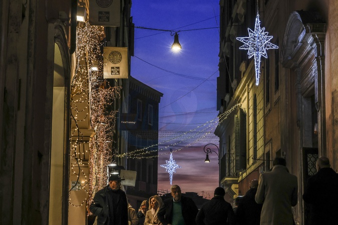 December 8, 2025, Rome. Inauguration of the Christmas lights on Via del Corso. Pictured: lights on Via Vittoria at dusk., Credit:Richard De Luca / Avalon