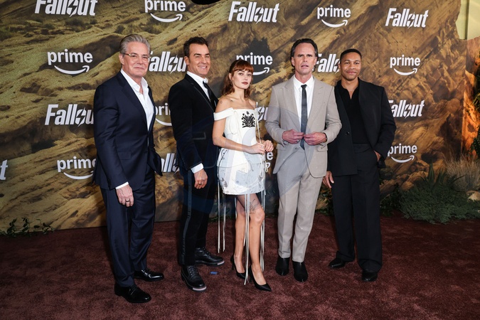 MUSEUM ROW, MIRACLE MILE, LOS ANGELES, CALIFORNIA, USA - DECEMBER 08: American actor Kyle MacLachlan wearing Zegna, American actor and filmmaker Justin Theroux, English actress Ella Purnell, American actor Walton Goggins wearing Tom Ford and a David Yurman ring and American actor Aaron Moten arrive at the Los Angeles Premiere Of Amazon Prime Video's 'Fallout' Season 2 held at the Academy Museum of Motion Pictures on December 8, 2025 in Museum Row, Miracle Mile, Los Angeles, California, United States., Credit:Xavier Collin / Avalon