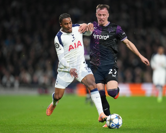 Wilson Odobert of Tottenham Hotspur and Tomas Vlcek of Slavia Prague battle for ball during the UEFA Champions League Matchday 6 of 8 Tottenham Hotspur vs Slavia Prague at Tottenham Hotspur Stadium, London, United Kingdom, 9th December 2025, Credit:Harvey Murphy/News Images / Avalon