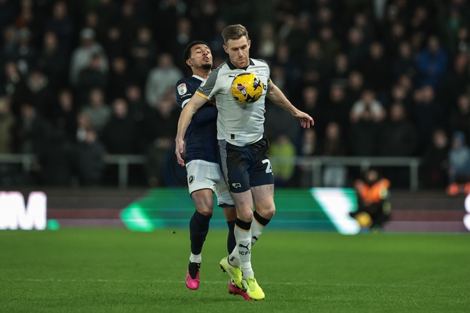 Callum Elder of Derby County controls the ball pressured by Femi Azeez of Millwall during the Sky Bet Championship match Derby County vs Millwall at Pride Park Stadium, Derby, United Kingdom, 10th December 2025, Credit:Mark Cosgrove/News Images / Avalon