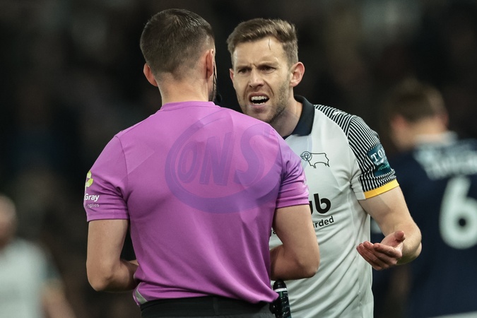 Callum Elder of Derby County reacts before Referee Thomas Kirk gives him a yellow card during the Sky Bet Championship match Derby County vs Millwall at Pride Park Stadium, Derby, United Kingdom, 10th December 2025, Credit:Mark Cosgrove/News Images / Avalon