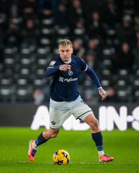 Alfie Doughty of Millwall dribbles the ball during the Sky Bet Championship match Derby County vs Millwall at Pride Park Stadium, Derby, United Kingdom, 10th December 2025, Credit:Maynard Manyowa/News Images / Avalon