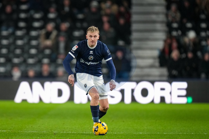 Alfie Doughty of Millwall dribbles the ball during the Sky Bet Championship match Derby County vs Millwall at Pride Park Stadium, Derby, United Kingdom, 10th December 2025, Credit:Maynard Manyowa/News Images / Avalon