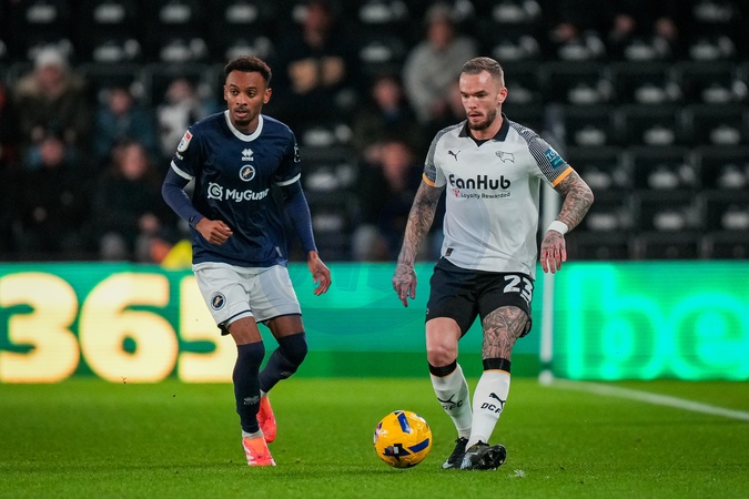 Joe Ward of Derby County battles for the ball with Thierno Ballo of Millwall during the Sky Bet Championship match Derby County vs Millwall at Pride Park Stadium, Derby, United Kingdom, 10th December 2025, Credit:Maynard Manyowa/News Images / Avalon