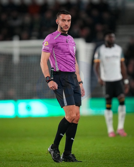 Referee Thomas Kirk during the Sky Bet Championship match Derby County vs Millwall at Pride Park Stadium, Derby, United Kingdom, 10th December 2025, Credit:Maynard Manyowa/News Images / Avalon