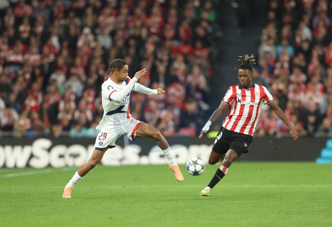 Athletic Club v Paris Saint-Germain PSG - UEFA Champions Bradley Barcola (Paris Saint-Germain) and Nicholas Williams Arthuer (Athletic Club) battle for the ball, Credit:Juan Lazkano / Avalon
