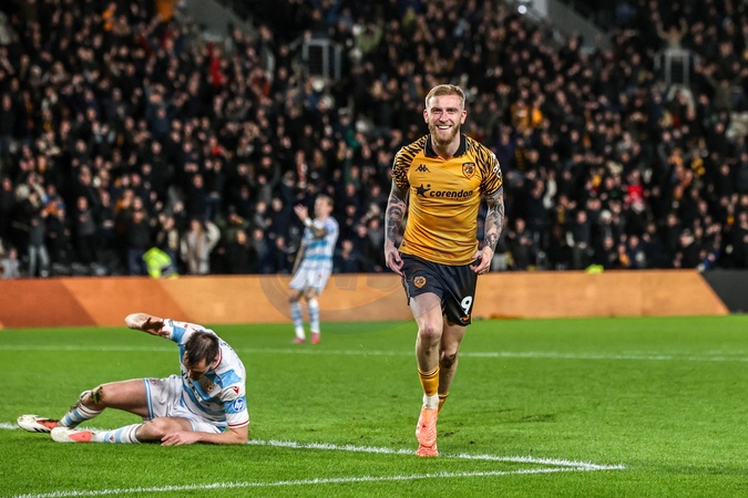 Oliver McBurnie of Hull City celebrates his goal to make it 2-0 during the Sky Bet Championship match Hull City vs Wrexham at MKM Stadium, Hull, United Kingdom, 10th December 2025, Credit:Ae Cosgrove/News Images / Avalon